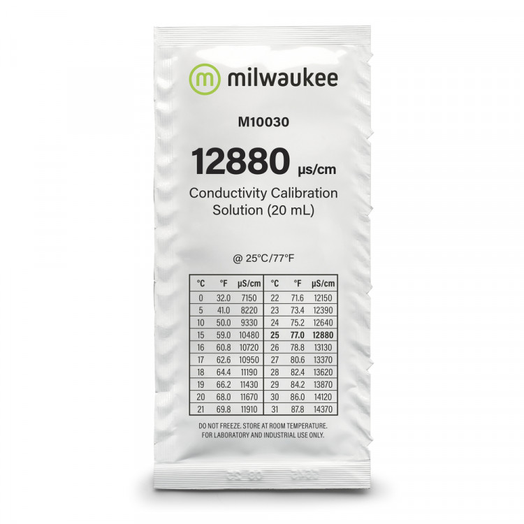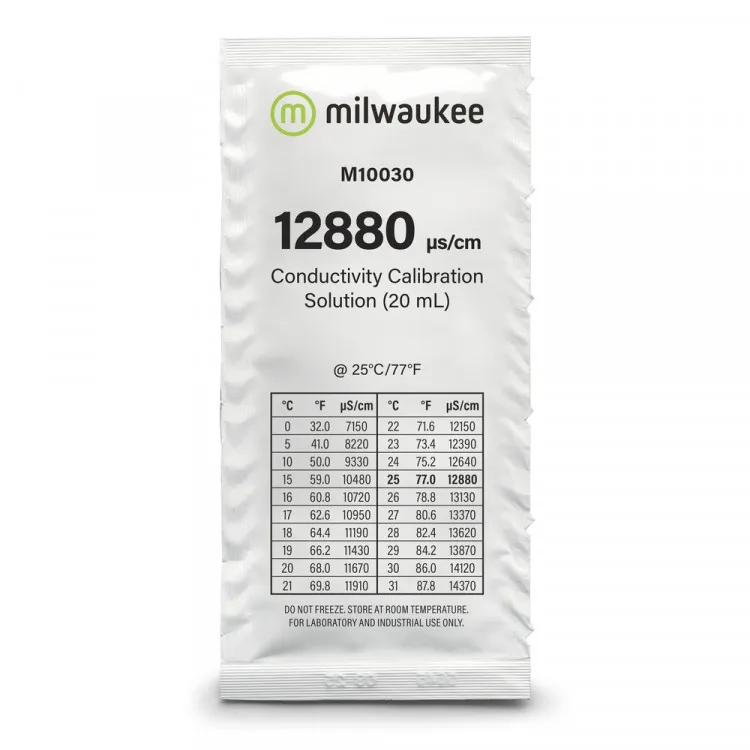 Milwaukee 12880 µS/cm — профессиональный калибровочный раствор высокой электропроводности, предназначенный для точной настройки кондуктометров (EC-метров) при работе в диапазоне средних и высоких значений EC. Одноразовый пакет объёмом 20 мл позволяет выполнять калибровку прямо в саше, без переливания и риска загрязнения.