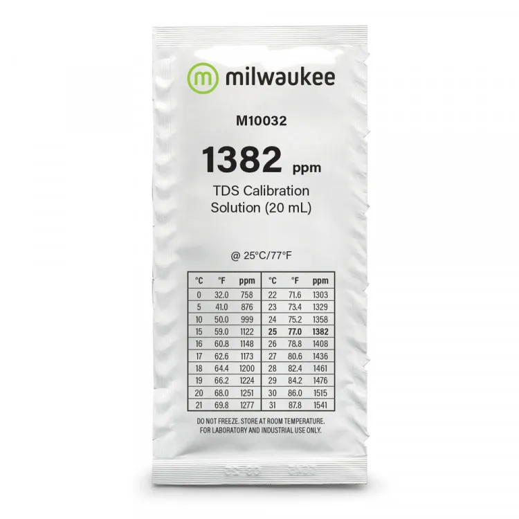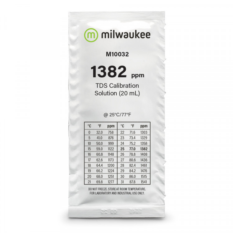 Milwaukee 1382 ppm — калибровочный раствор для точной настройки TDS-метров, используемых для измерения минерализации (солесодержания) воды. Одноразовый пакет объёмом 20 мл позволяет выполнять калибровку прямо в саше, обеспечивая точность и удобство без дополнительных ёмкостей.