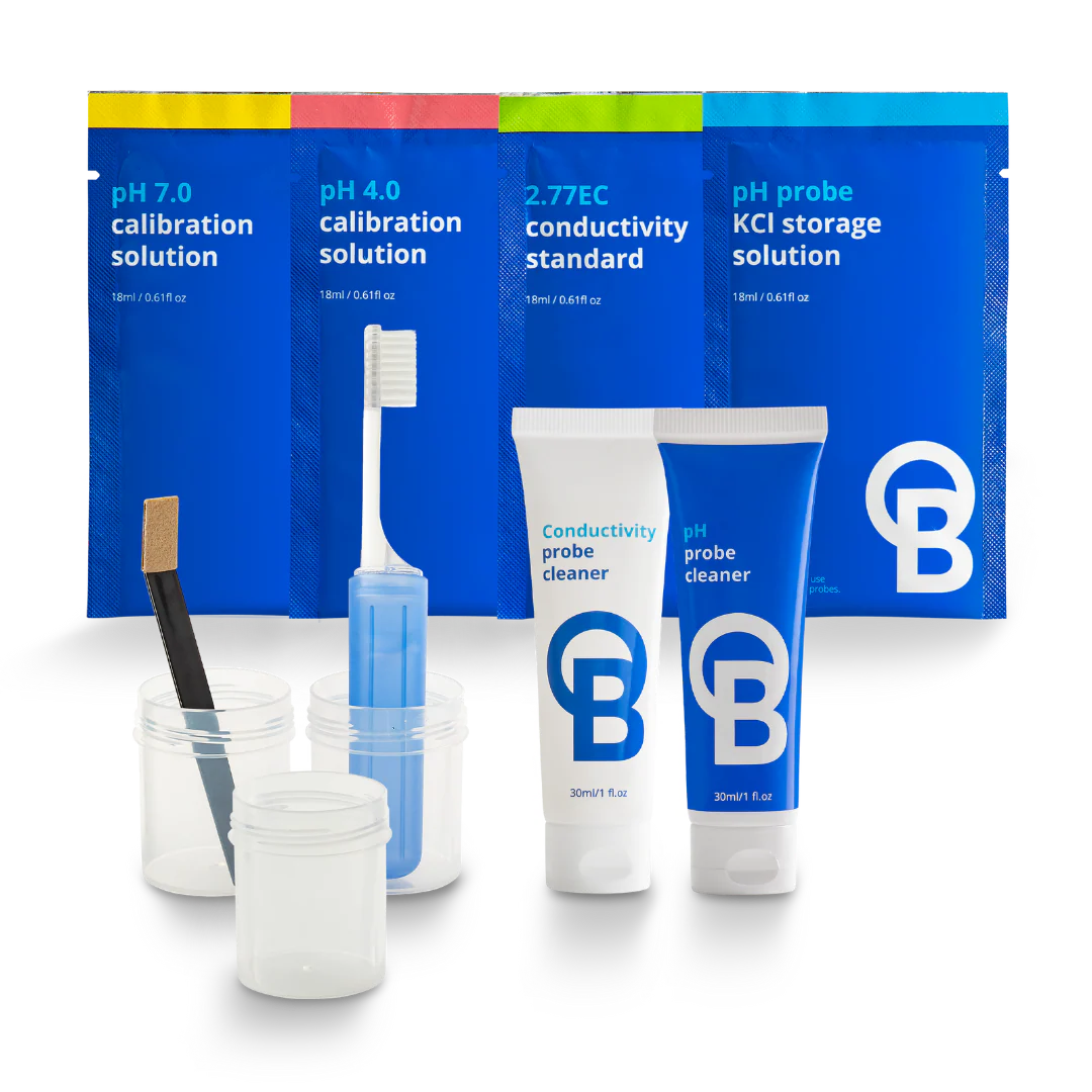 Набор содержит всё необходимое для полноценного обслуживания измерительных приборов Bluelab. Очистители удаляют минеральные и органические отложения, калибровочные растворы обеспечивают точную настройку pH- и EC-датчиков, а раствор KCl поддерживает оптимальное состояние pH-электрода при хранении.